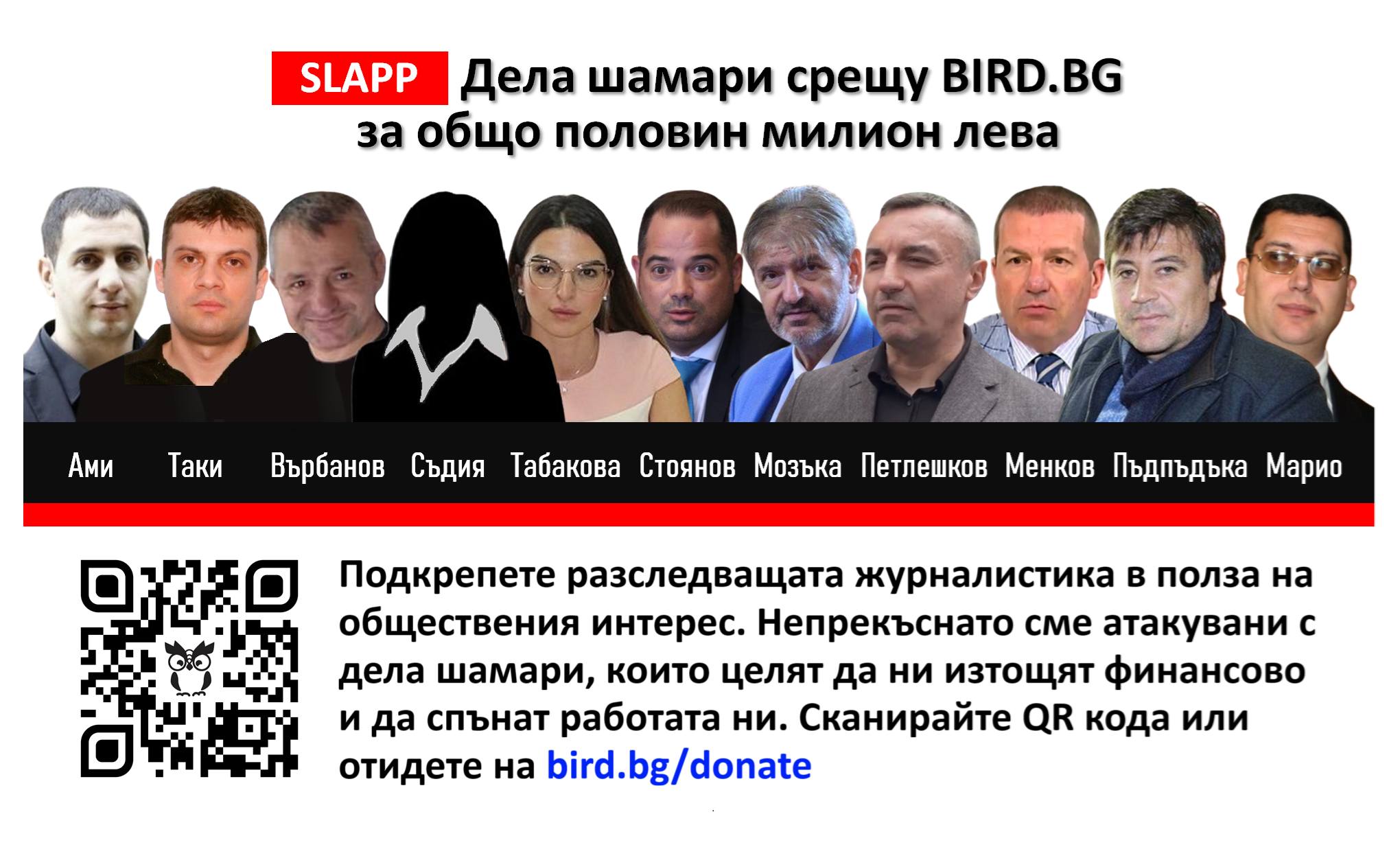 Така общата сума по заведените срещу журналистите от BIRD.BG вече 20 дела шамари #SLAPP е ПОЛОВИН МИЛИОН лева! Само адвокатските хонорари са близо 50 000 лв. Целта им е да ни спрат. Да не влизаме в тила на корумпираните политици и кохортата им от крадци, мошеници, нотариуси и джуджета с чекмеджета в евро! Да не вадим наяве корпулентни офшорки, скъпо платени зависимости, евтино придобити имоти, миски с бикини и кирливи ризи на мистъри и министри.