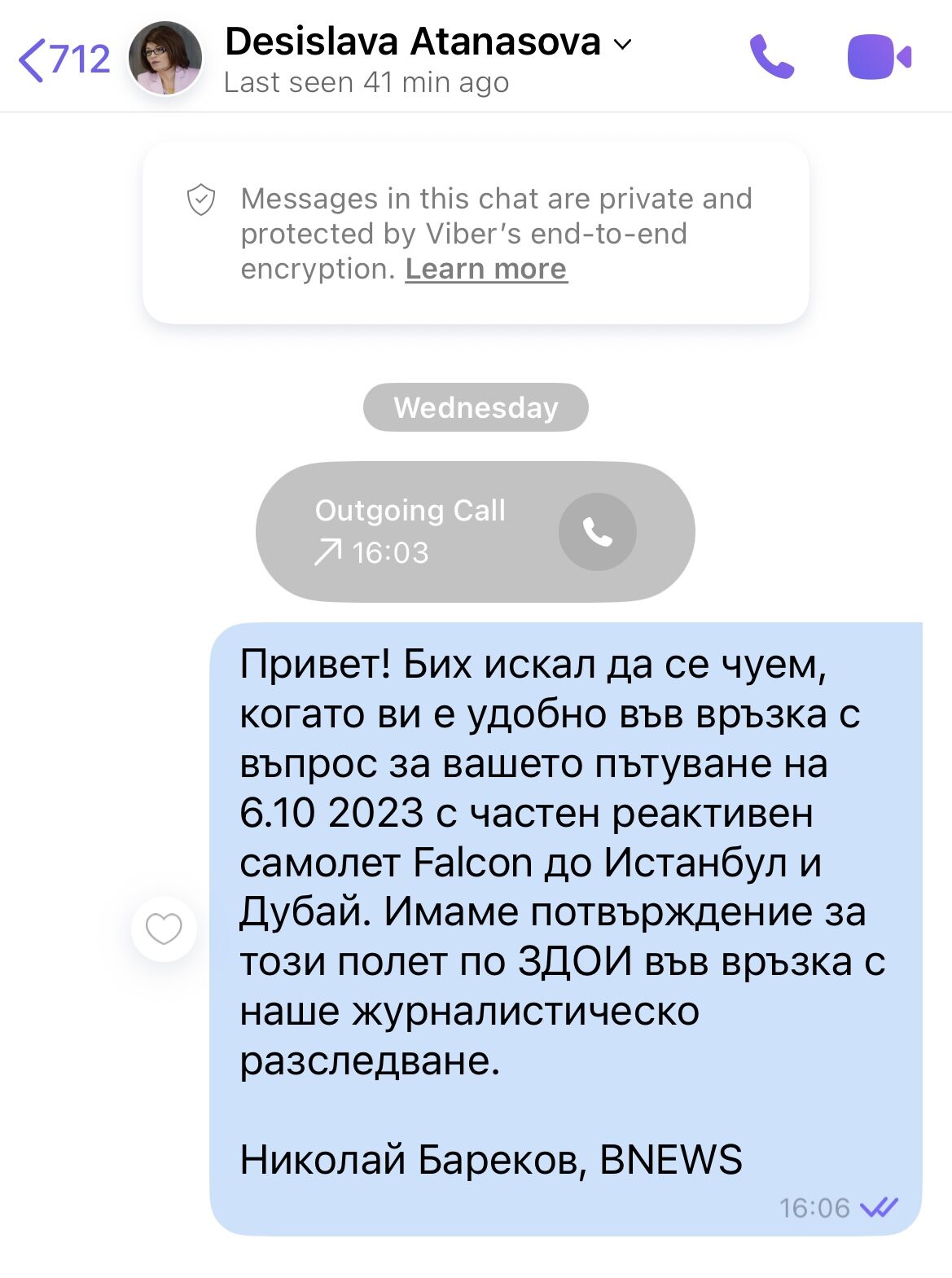 Привет! Бих искал да се чуем, когато ви е удобно във връзка с въпрос за вашето пътуване на 6.10 2023 с частен реактивен самолет Falcon до Истанбул и Дубай. Имаме потвърждение за този полет по ЗДОИ във връзка с наше журналистическо разследване.