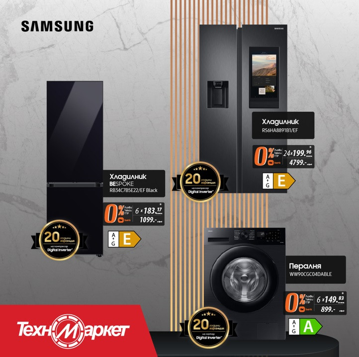 Любимата на милиони потребители търговска верига „Техномаркет“ се е погрижила за почитателите на добрия вкус и високата естетика в домашния уют с изключително елегантните уреди на Samsung. Пералнята и двата хладилника на бранда съчетават модерна визия и от полезни функции.